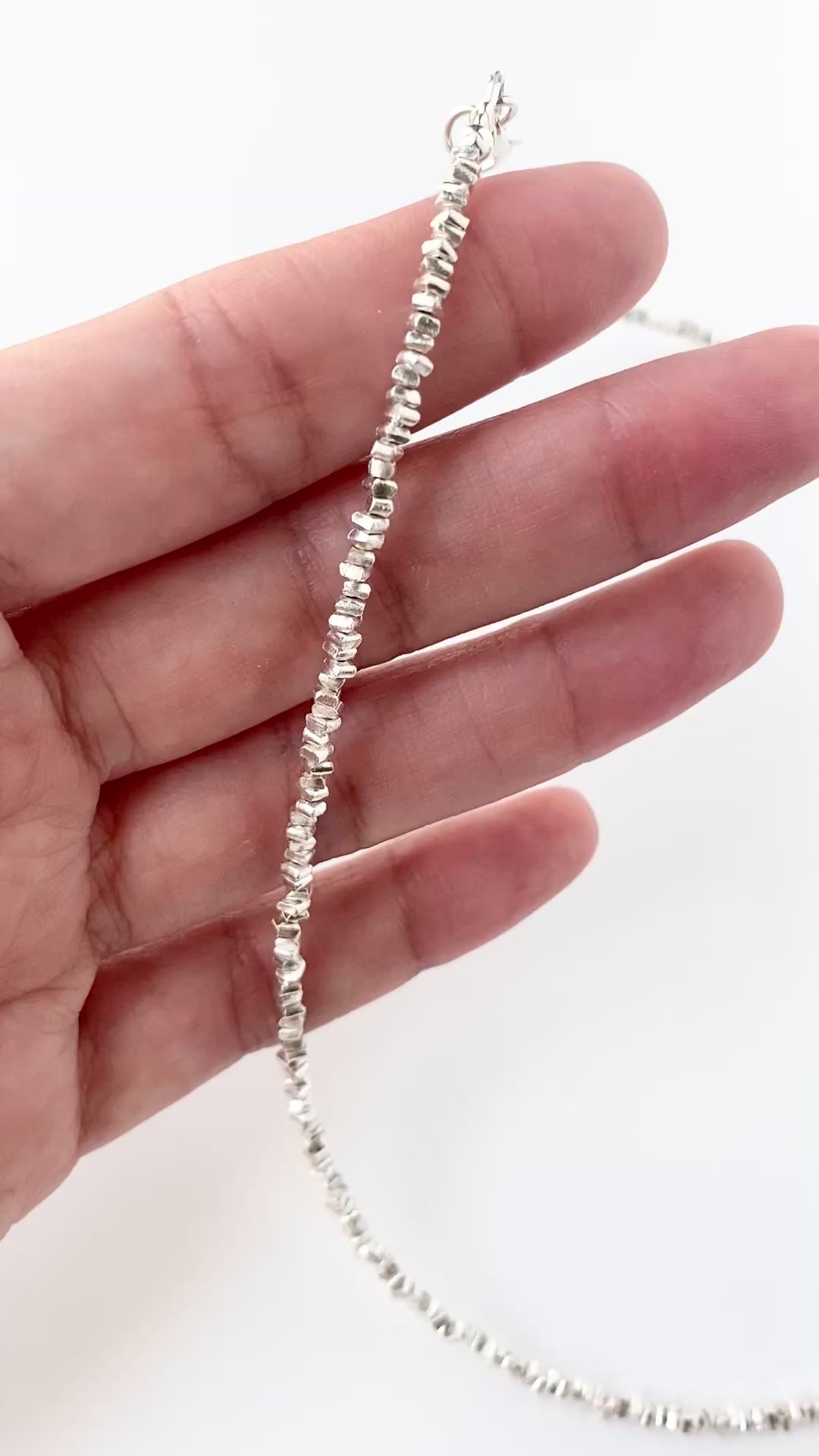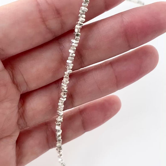 Tiny squared chip-style silver beaded necklace with a modern edge, sparkling like starlight bursts.