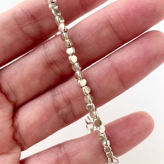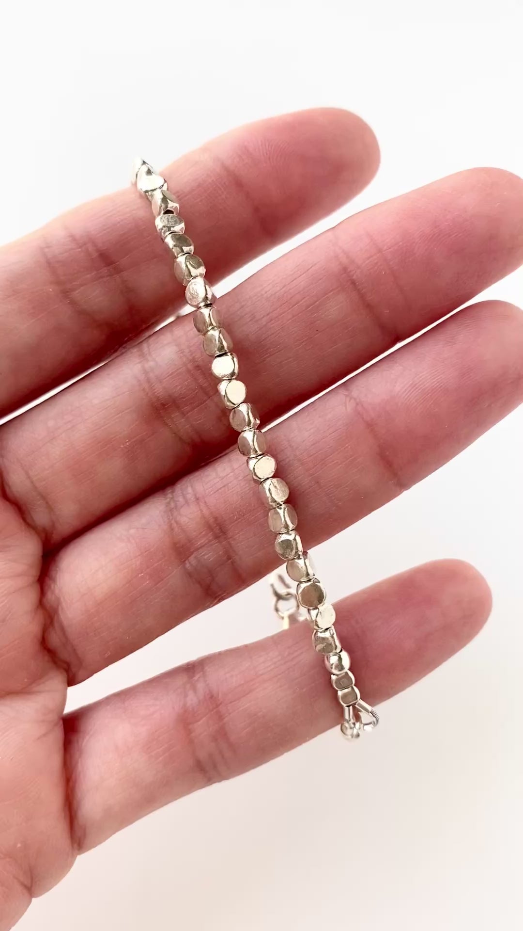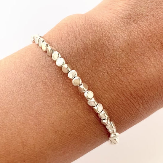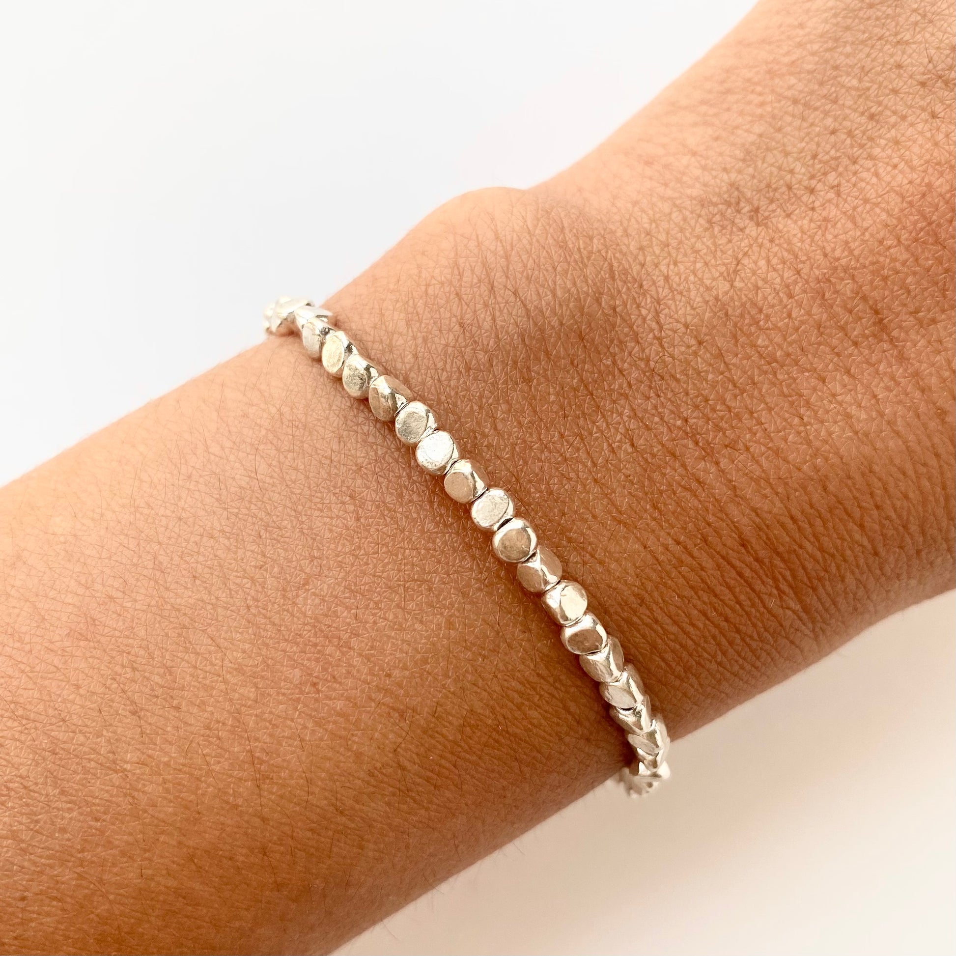 Irregular-shaped beaded silver bracelet, artisanal and natural, reminiscent of celestial textures.