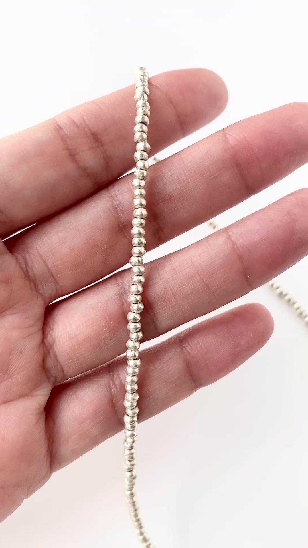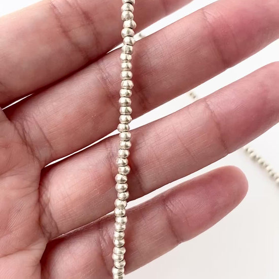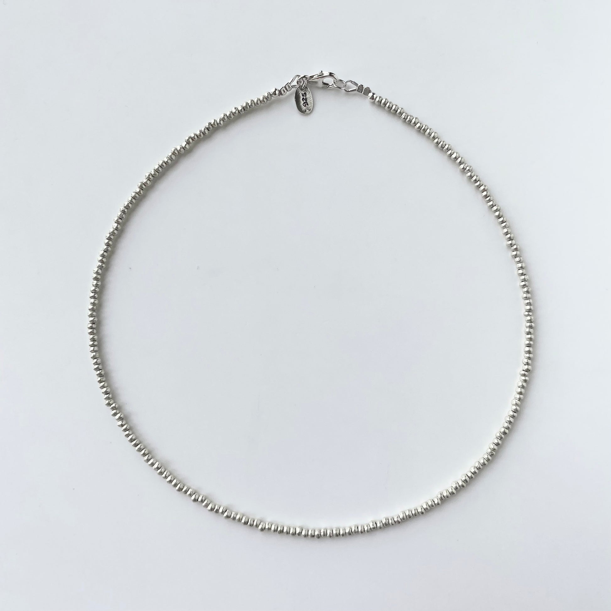 Rounded seed-like beaded silver necklace with subtle shine, inspired by the beauty of new beginnings.