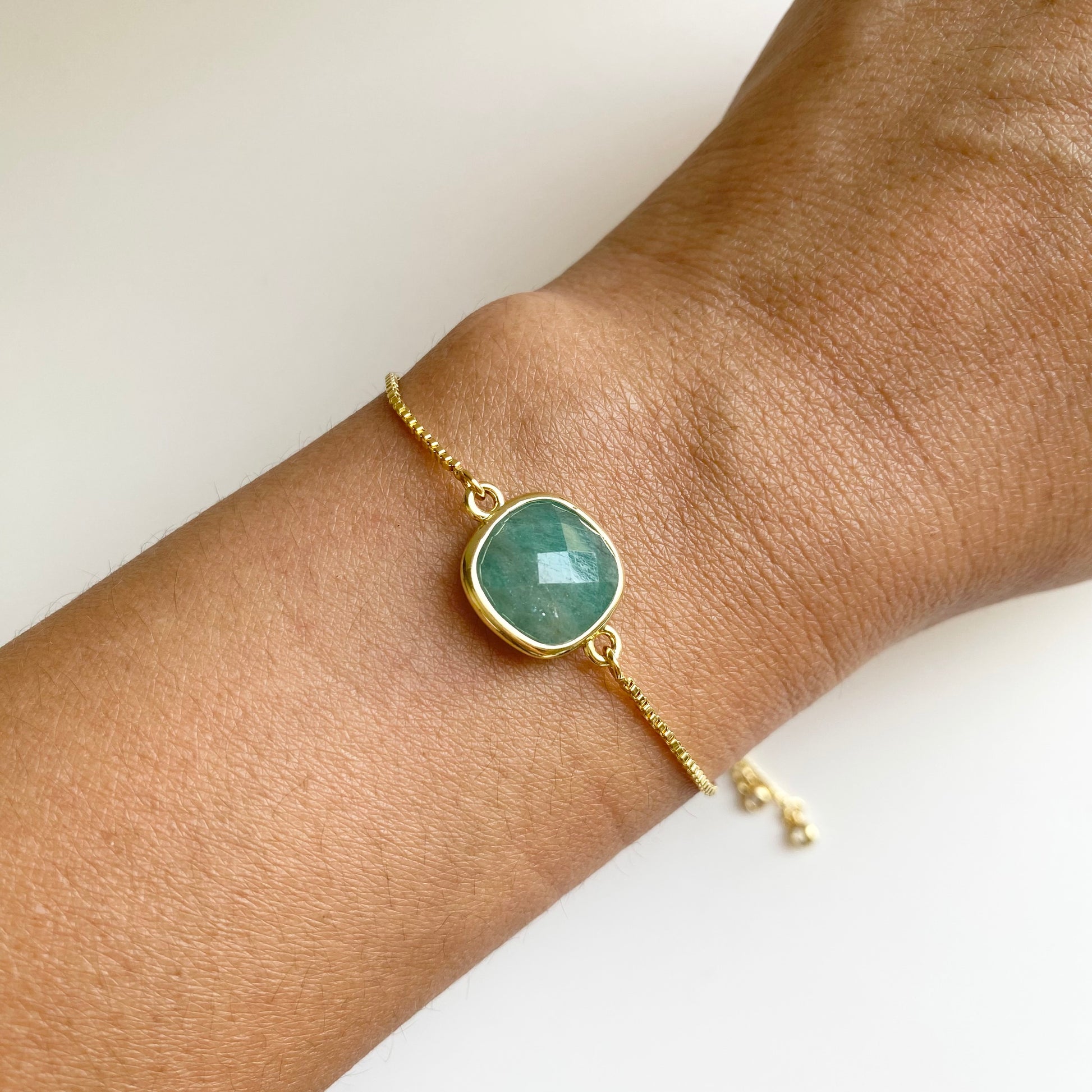Effortlessly chic, this dainty adjustable bracelet features a single square faceted Green Aventurine crystal-radiating calming green tones that inspire luck and new beginnings. Set on 18k gold-plated stainless steel with an easy-to-wear slider lock, it’s perfect worn solo for a minimal look or stacked with gold or earthy-toned pieces. A subtle statement for both casual days and elegant nights.