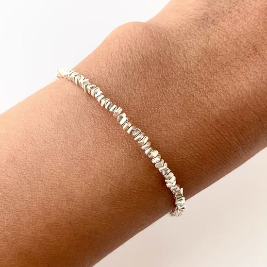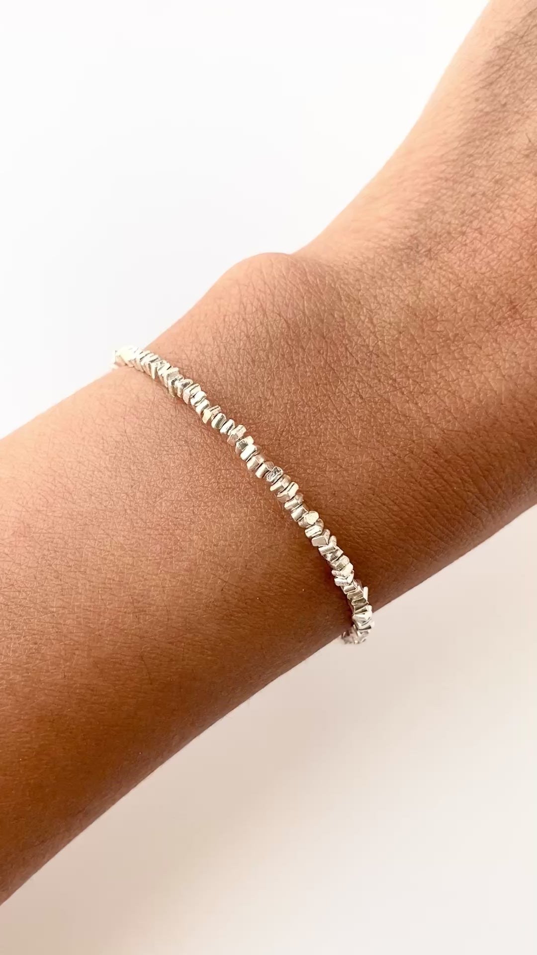 Tiny squared chip-style silver beaded bracelet with a modern edge, sparkling like starlight bursts.
